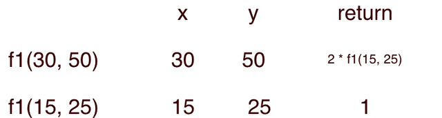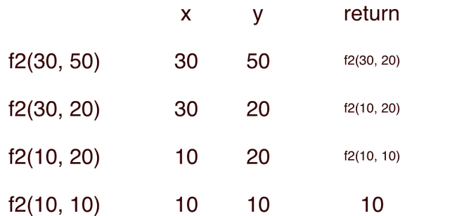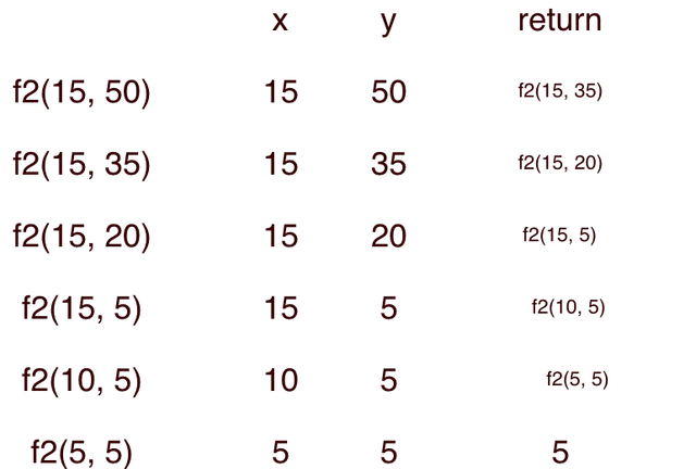 Observam faptul ca functia f2 efectueaza scaderi succesive din numarul mai mare pana cand cele doua numere sunt egale. Am discutat despre aceasta metoda in acest articol: Algoritmul lui Euclid in C++ .