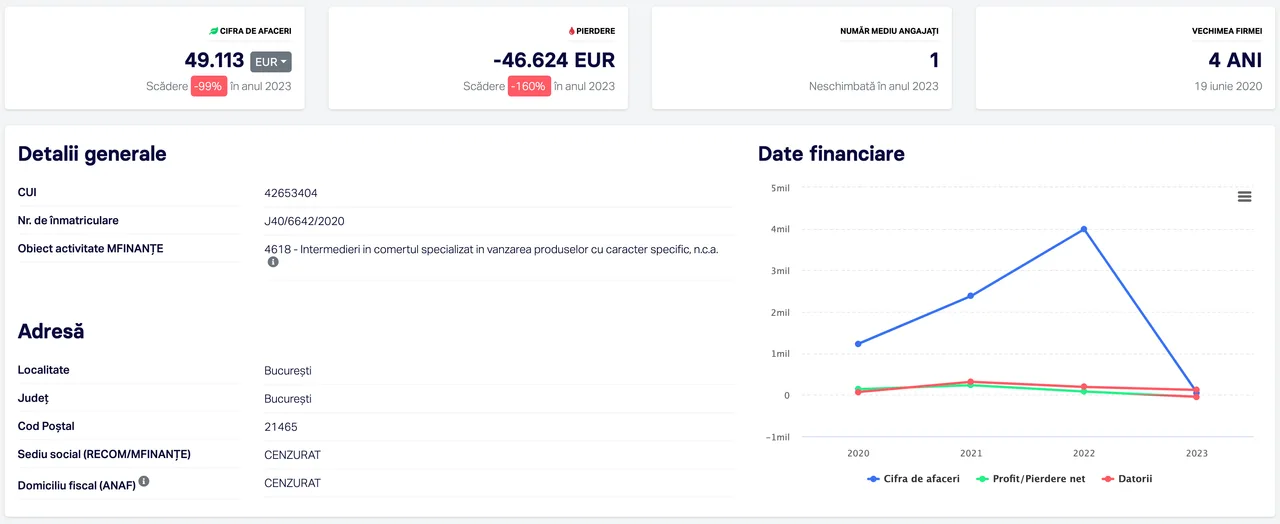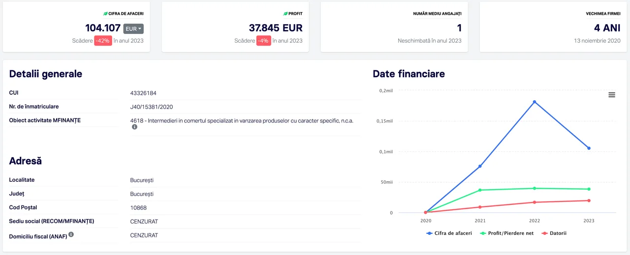 Din cate puteti observa, firmele lui Razvan par a fi in cadere libera de cand s-a terminat pandemia. Prima firma este cea pe care o scoate in fata si cu care se flexeaza la fraieri, iar cea de a doua firma este firma de pe care factureaza cursurile pe care acesta le vinde.