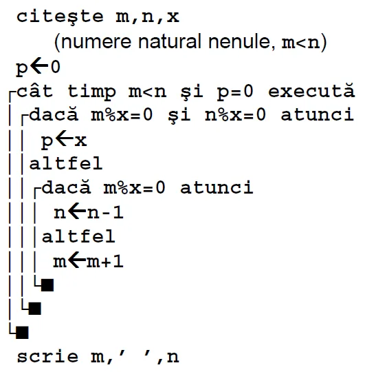b. Scrieţi un set de valori care pot fi citite pentru variabilele m, n şi x, astfel încât, în urma executării algoritmului, să se afişeze două numere egale.