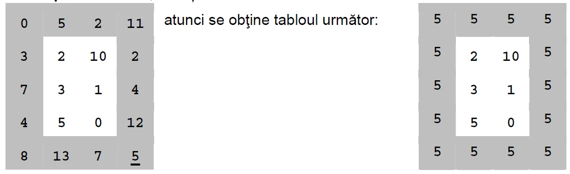 5. Scrieţi un program C/C++ care citeşte de la tastatură două numere naturale din intervalul [3,50], n şi m, și elementele unui tablou bidimensional cu n linii şi m coloane, numere naturale din intervalul [0,104]. Programul modifică în memorie tabloul dat, atribuind valoarea elementului aflat pe ultima linie și pe ultima coloană a tabloului fiecărui element aflat pe conturul acestuia (pe prima linie, ultima linie, prima coloană, ultima coloană), apoi afişează pe ecran tabloul modificat, câte o linie a tabloului pe câte o linie a ecranului, elementele fiecărei linii fiind separate prin câte un spaţiu.