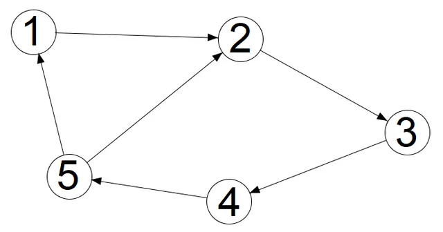 Luam exemplul de mai sus. Avem 5 varfuri cu 6 arce intr-un graf orientat. Vom scrie matricea acesteia de adiacenta. Voi numerota nodurile in sensul acelor de ceasornic.