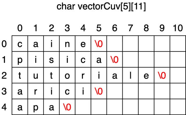 Sa spunem ca vrem sa citim 5 cuvinte ce pot sa aiba maxim 10 caractere. Primul pas este sa declaram vectorul de cuvinte respectand regula de mai sus. Daca citim urmatoarele cuvinte (in aceasta ordine):